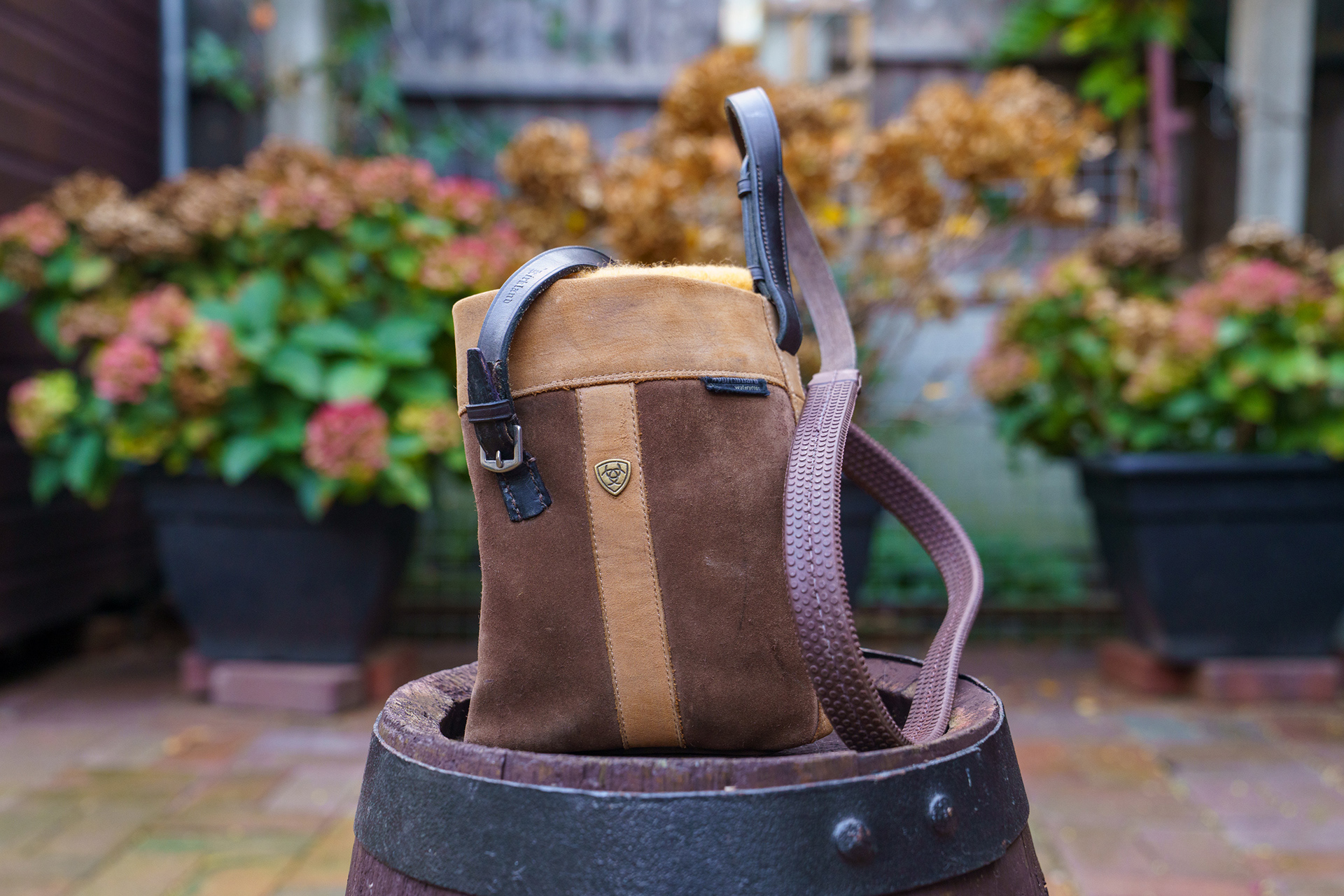 Featuring a pure wool Whitney privacy flap and rubber rein shoulder/cross body strap